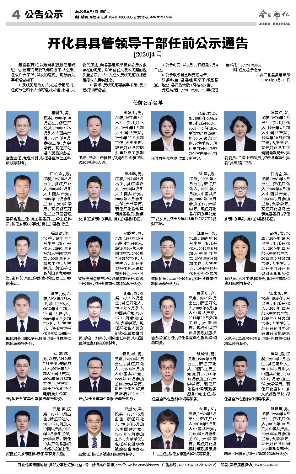 开化县县管领导干部任前公示通告