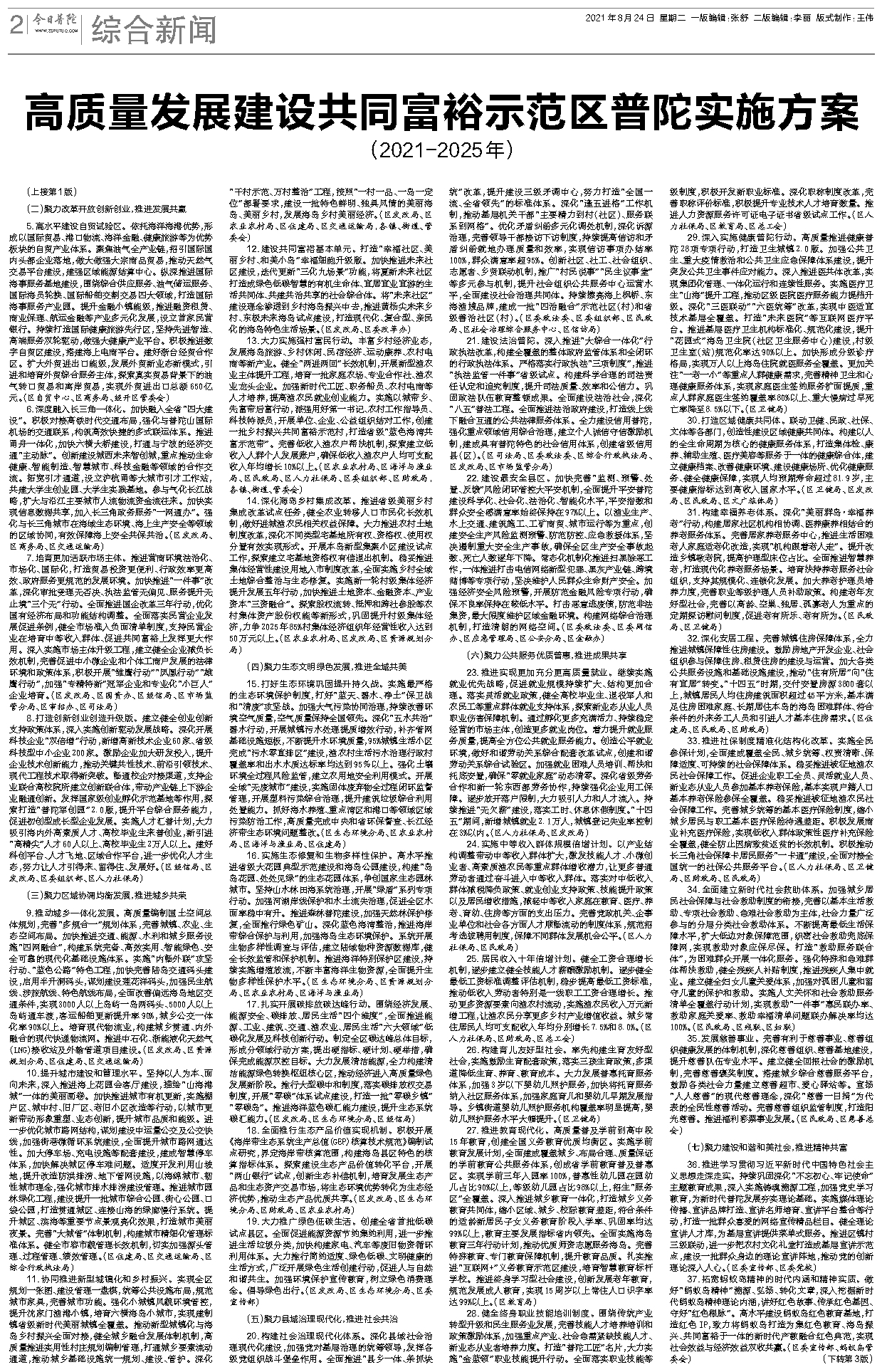 高质量发展建设共同富裕示范区普陀实施方案