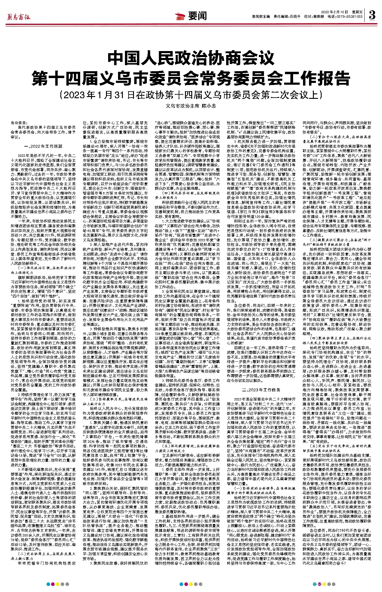 中国人民政治协商会议 第十四届义乌市委员会常务委员会工作报告